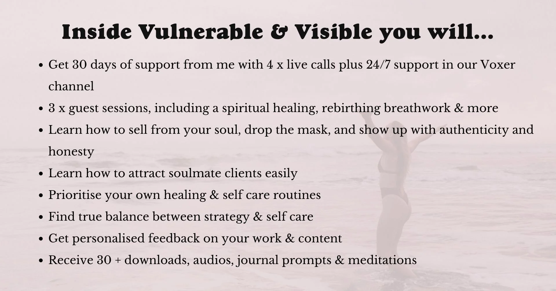This 4 week group container was built to provide you with a space to breathe, you know that feeling when you finally take your bra off after a long day out? Or when you whip off your mask as you come off the tube… that feeling. Without that pressured belief that by doing so your business will implode. We will also move through techniques, journaling prompts and strategies to start showing up as YOU. The real you, because in business, this is when the magic happens. Your soulmate clients want to see the real you, why are you hiding? Healing and strategy belong together like oat milk & coffee, and you deserve to have both. By prioritising